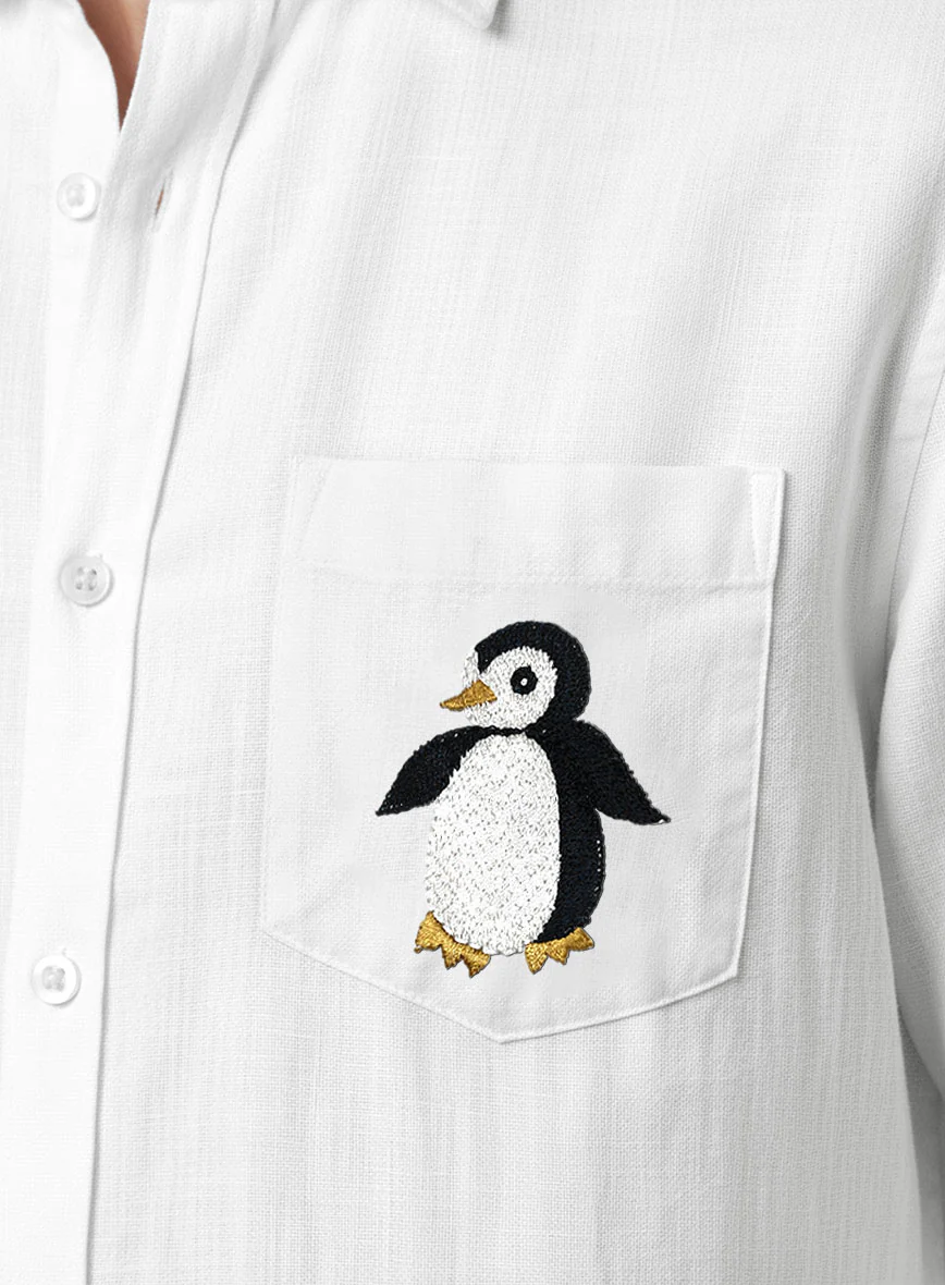 European White Linen Penguin Embroidered Shirt