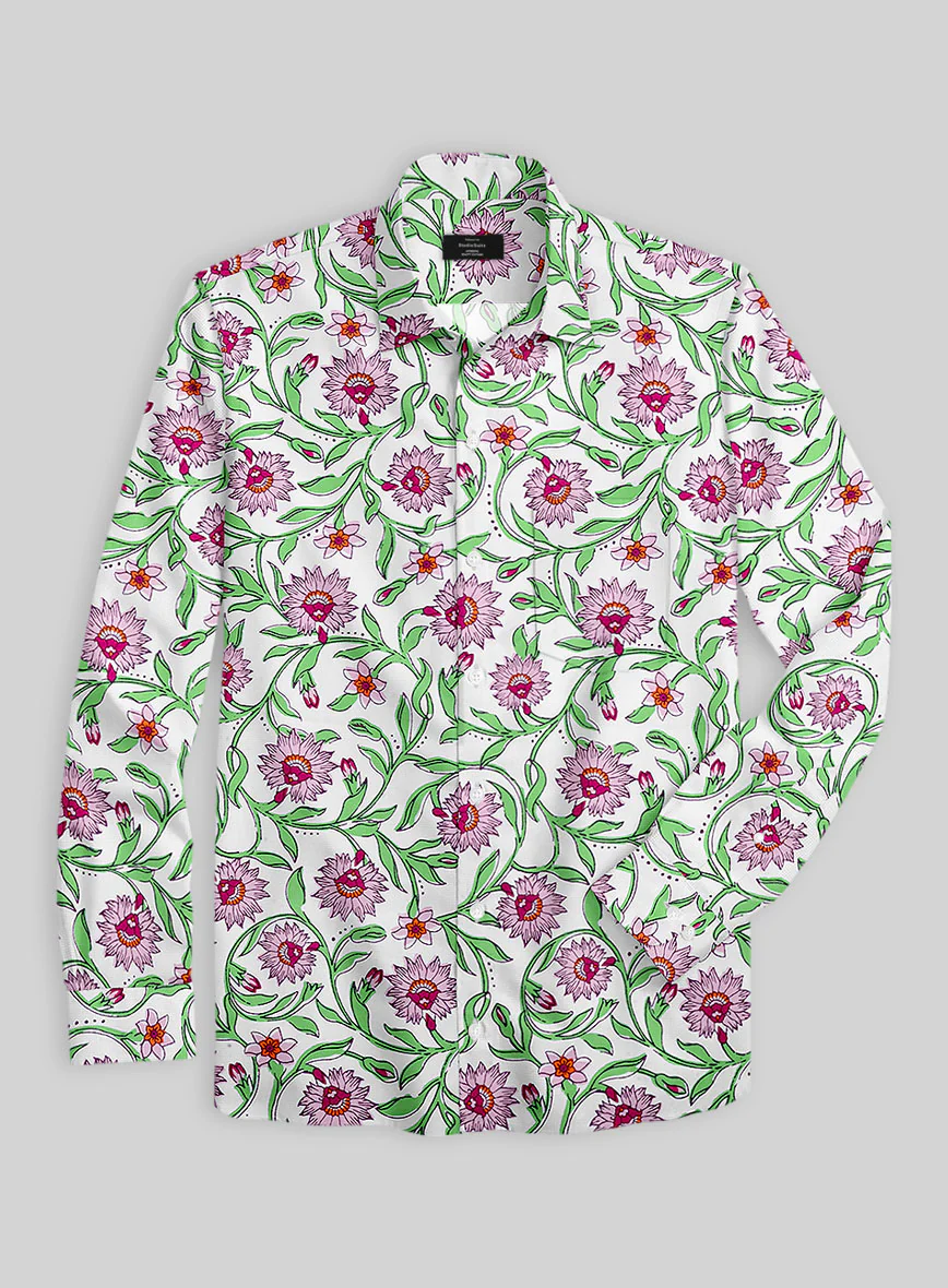 Breeze through the moments in bloom mode with our Petalflow Cotton Shirt. Crafted from soft, breathable cotton and adorned with playful pink blossoms and twirling green vines on a crisp white canvas, this shirt feels like spring bottled into fabric form.