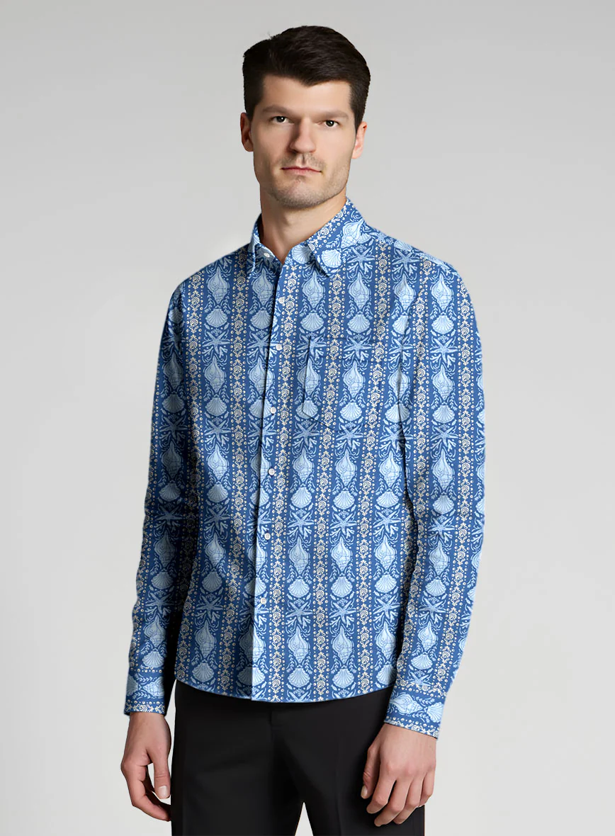 Dive into coastal charm with the Seashell Cotton Lycra Shirt. Crafted from soft cotton with a hint of stretch, this shirt boasts a rich ocean-blue base adorned with seashells, starfish, and floral motifs in sandy tones.