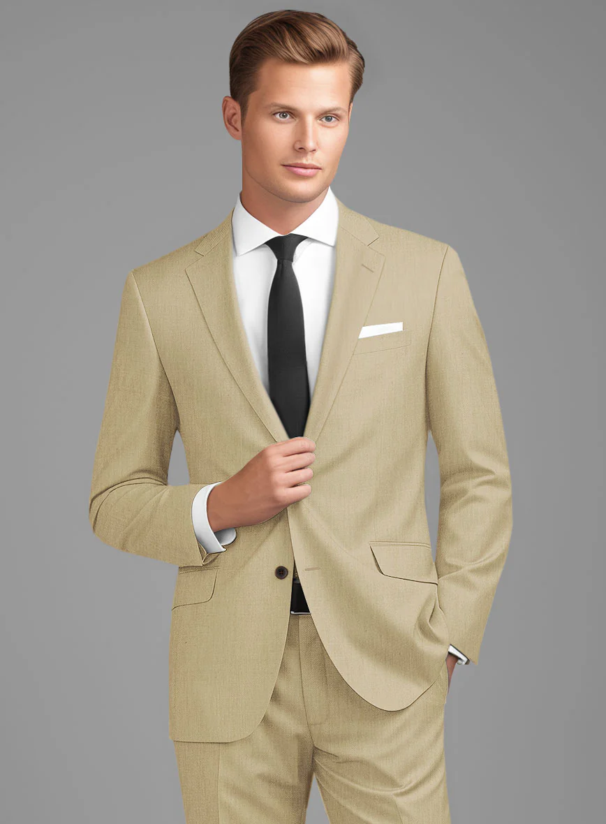 Sophisticated and extremely functional, our Stretch Beige Wool Suit maintains a sharp aesthetic from your morning coffee to evening cocktails. Crafted from wool polyester and lycra blend, the classic beige color and smooth feel of the suit is a perfect combination for a stylishly refined cold weather look that is timeless and comforting.Â