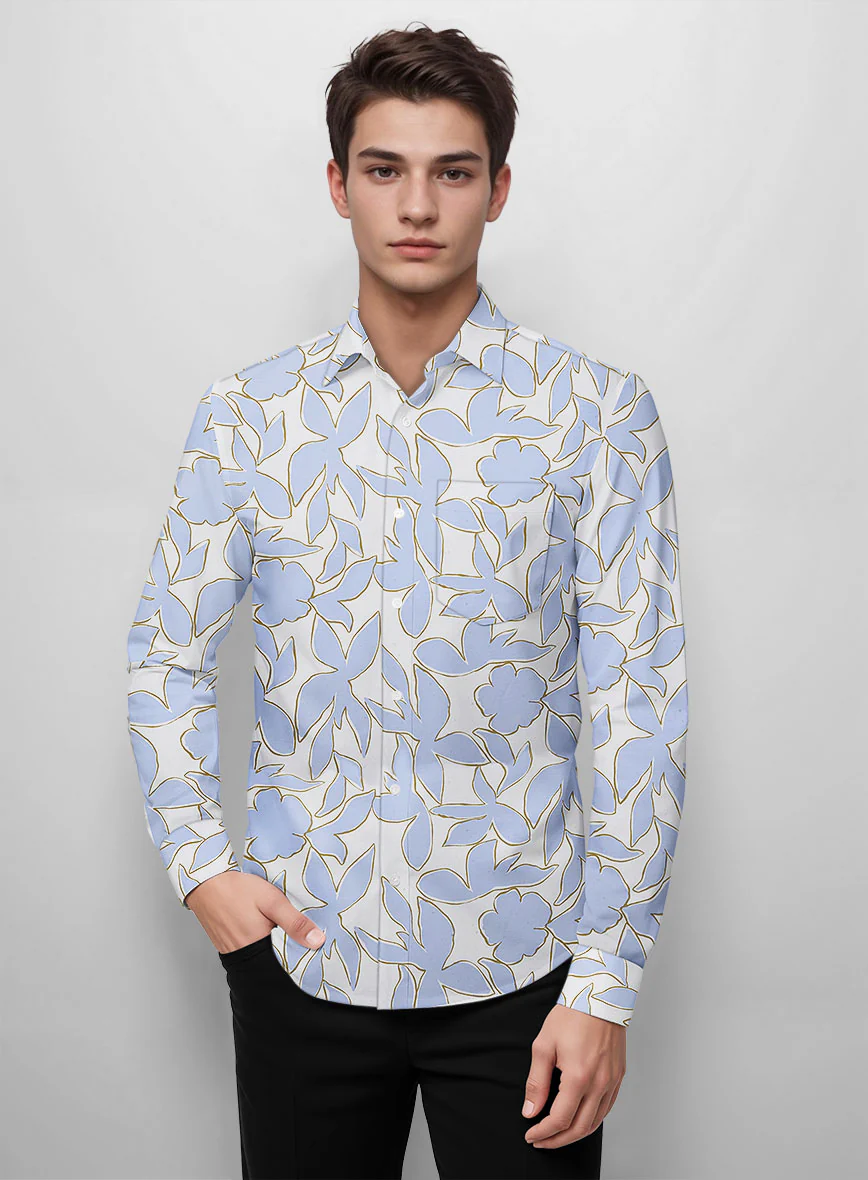 Breeze through the day in the Tranquil Leaf Cotton Shirt. Made from pure cotton, this shirt features a calming white base adorned with oversized sky-blue leaf silhouettes outlined in soft tan.
